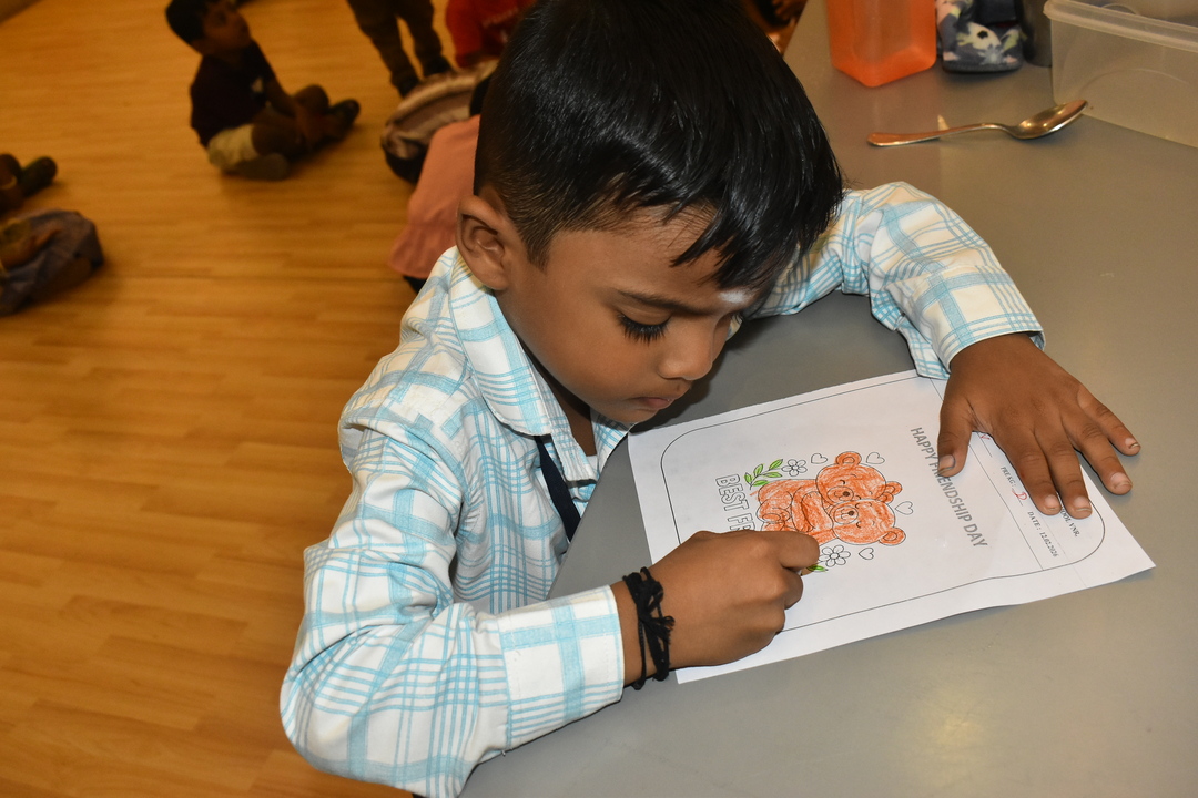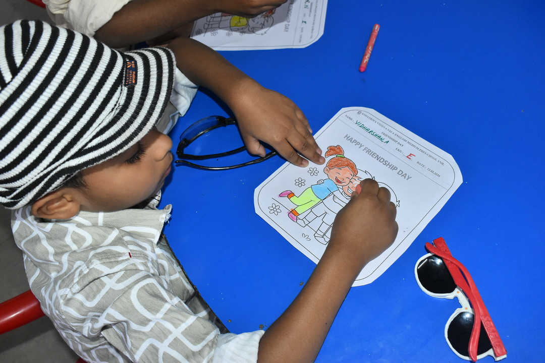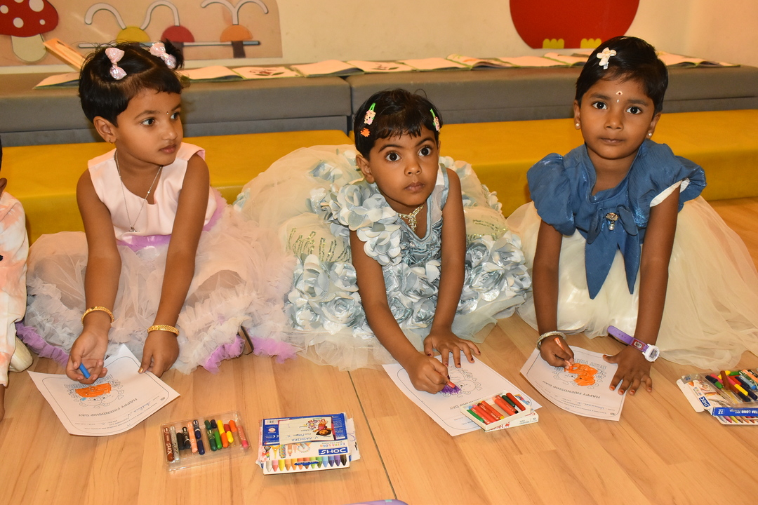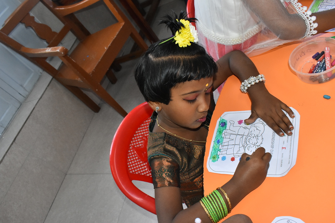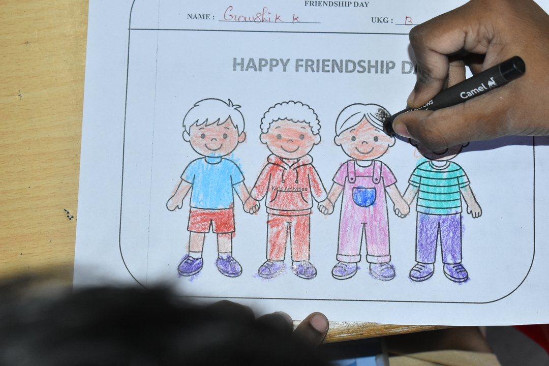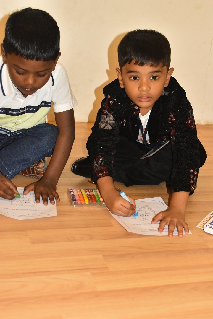 Pre-KG, LKG and UKG students participated in a colouring activity where they joyfully coloured creative pictures depicting friendship.